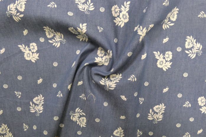 A Lovely Cotton Chambray Denim Floral Print In Tones Of Denim Blue And White
