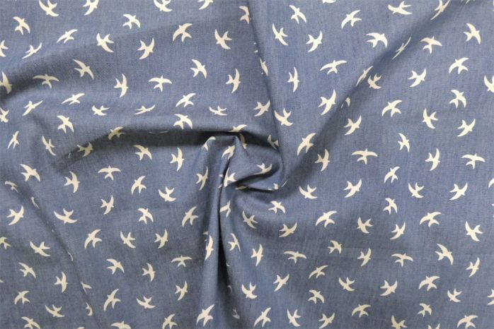 A Lovely Cotton Chambray Denim Swallows Print In Tones Of Denim Blue And White