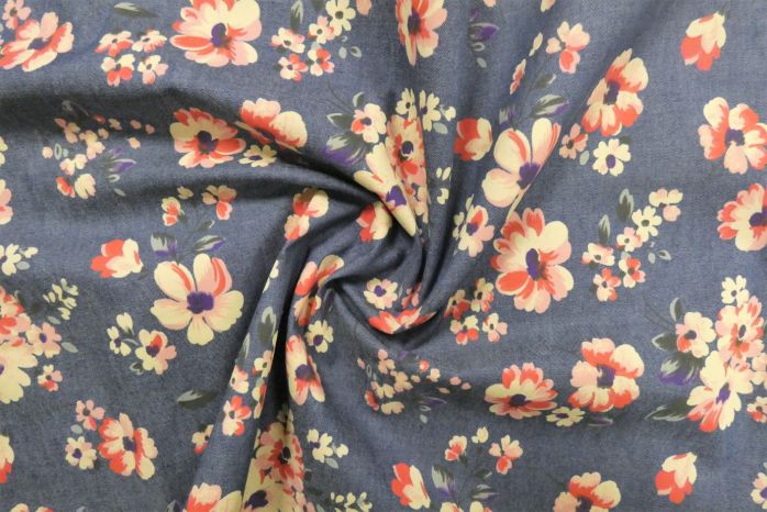 A Lovely Cotton Chambray Denim Floral Print In Tones Of Denim Blue, Ivory, Cadbury Purple, and Fuchsia
