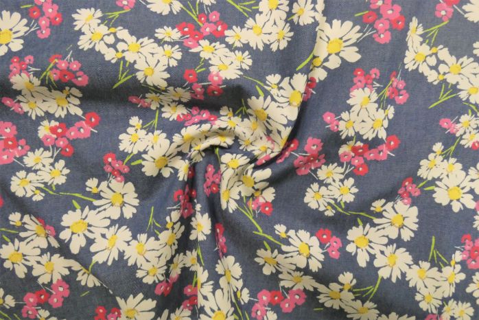 A Lovely Cotton Chambray Denim Floral Print In Tones Of Denim Blue, Ivory, Lemon, Fuchsia and Lime Green