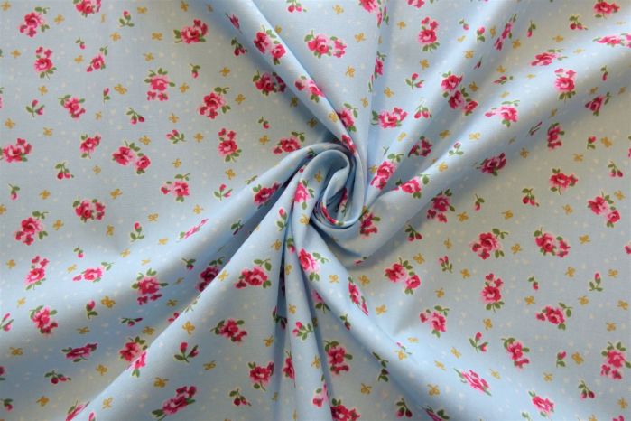 A Quality Ex-Designer 100% Cotton Poplin Floral Print with Red Roses on a Pale Blue Background