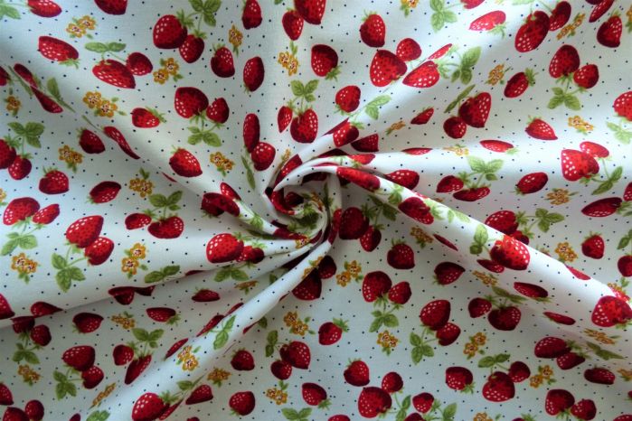 A Quality Ex-Designer 100% Cotton Poplin Print Featuring Strawberries on an Ivory Background