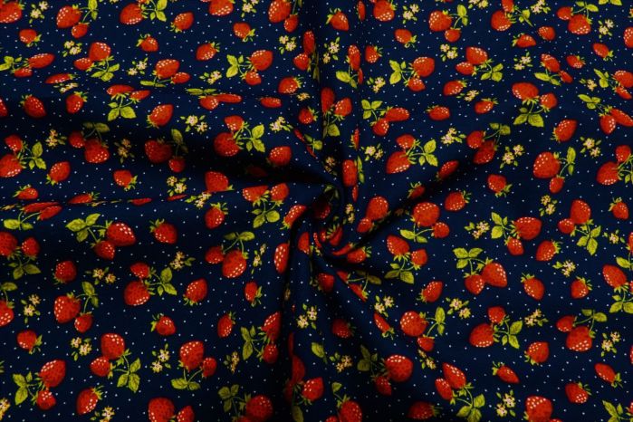 A Quality Ex-Designer 100% Cotton Poplin Print Featuring Strawberries on an Navy Background