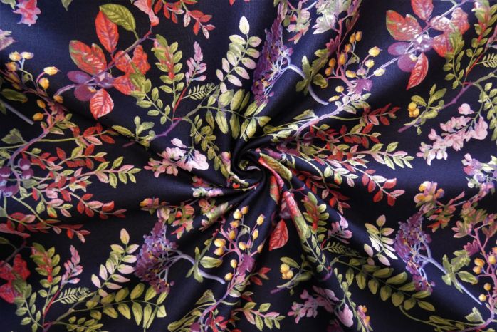 A Quality Ex-Designer 100% Cotton Poplin Digital Floral Print in Bright Tones on a Navy Background
