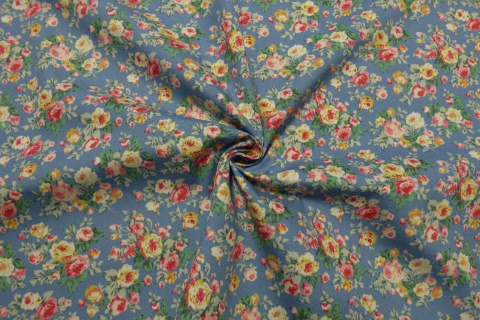 A Quality Ex-Designer 100% Cotton Poplin Digital Floral Print on a Dusky Blue Background