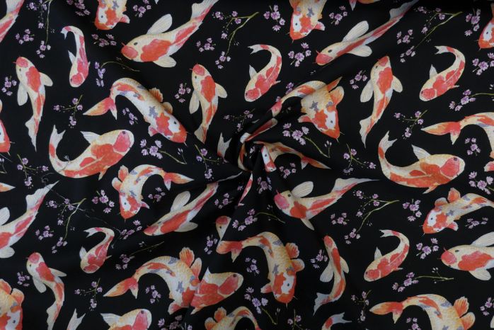 A Quality Ex-Designer 100% Cotton Poplin Fish Print in Deep Coral And Cream on Black