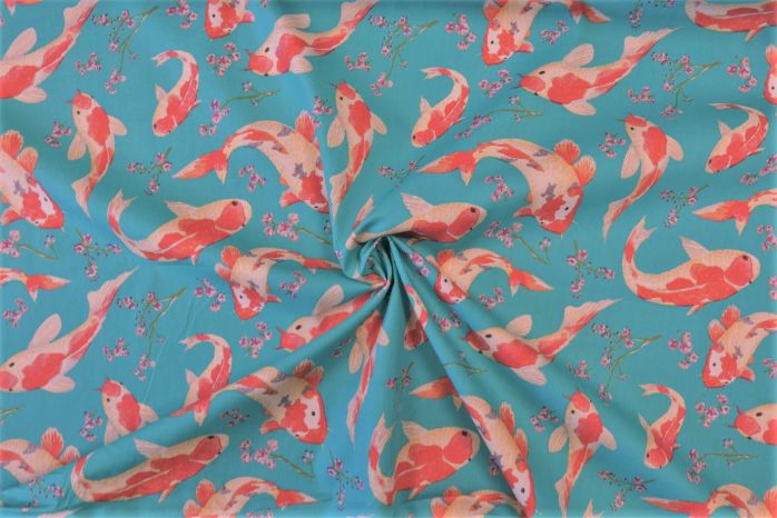 A Quality Ex-Designer 100% Cotton Poplin Fish Print in Deep Coral And Cream on Jade