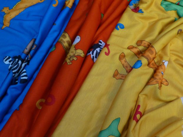 Really Attractive Animal & Alphabet Print Jersey In Royal, Burnt Orange & Sunflower
