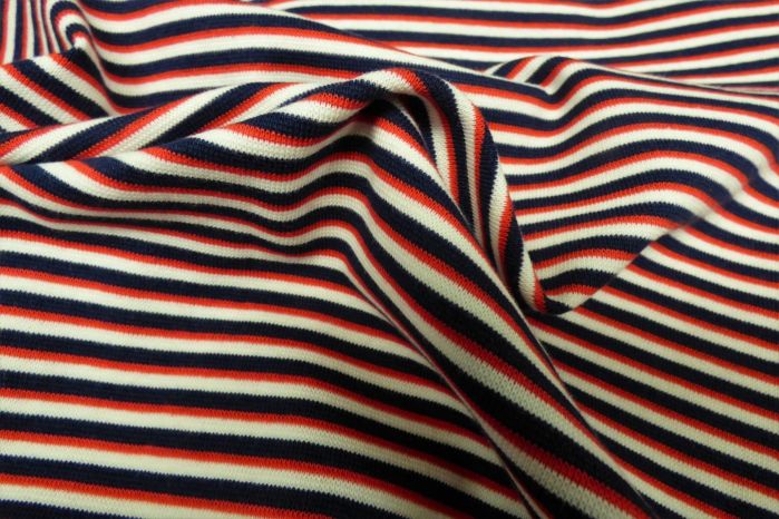 A Lovely Thick Quality Tubular Stretch Knitted Rib Jersey Stripe in Navy, Scarlet & White