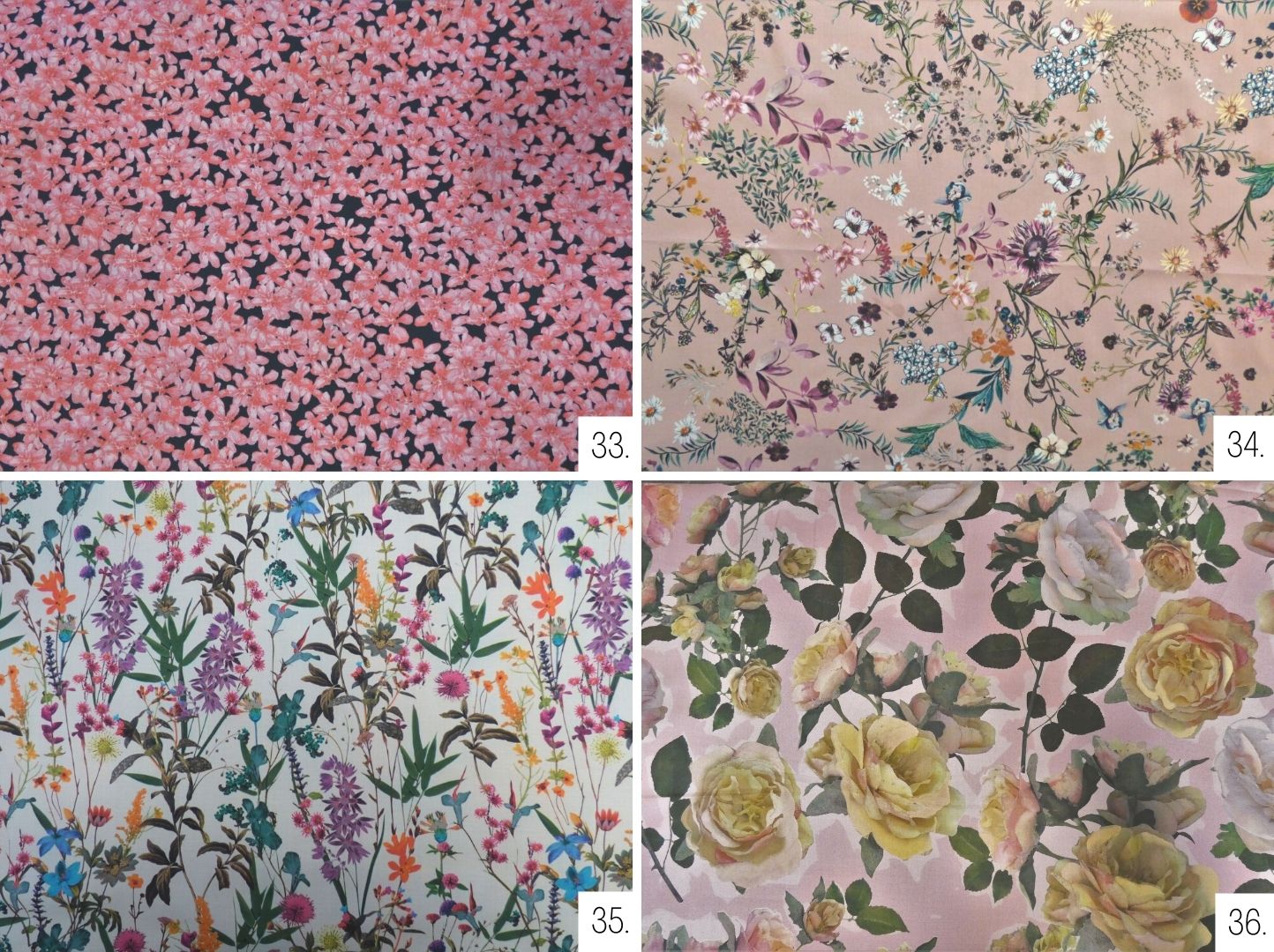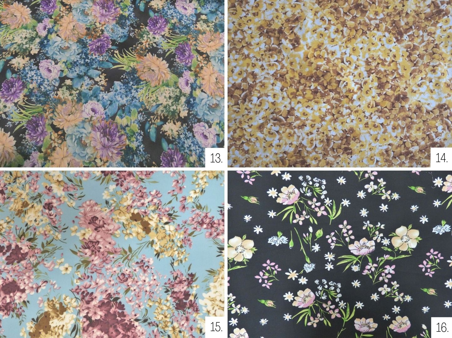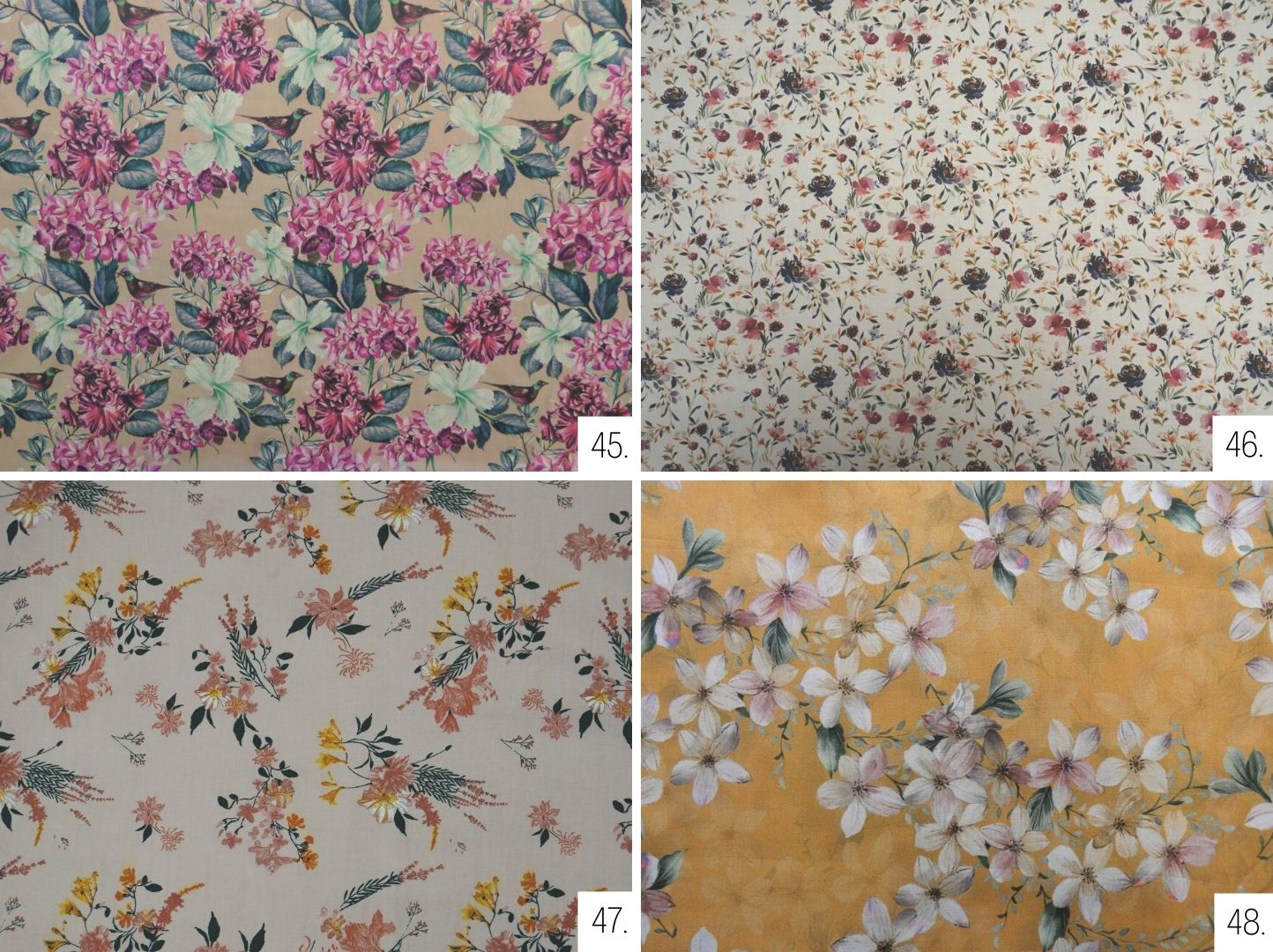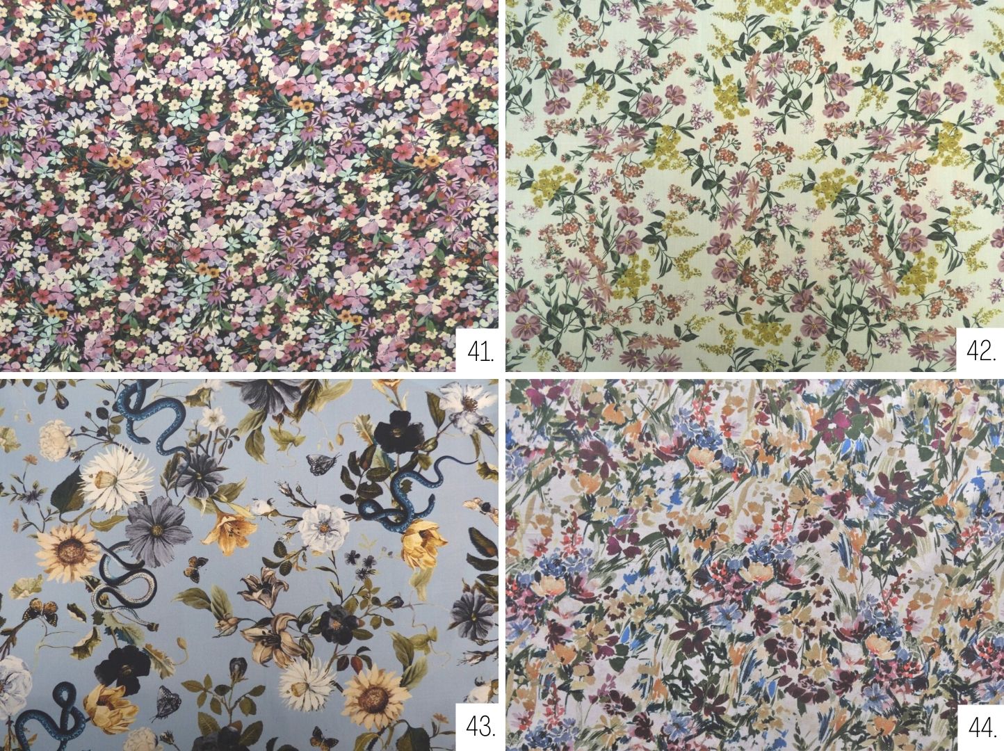 We've included a wide range of prints including ditsy florals, spring pastels, large blooms and much more. The basecloths are wide ranging too - cotton marlie-care lawns, viscose florenza crepe, silk crepe de chine, cool-touch crepe, viscose challis lawn, crepe jersey, polyester lena crepe etc.. There will definitely be something to tickle your fancy!