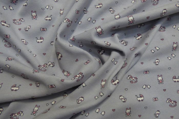 A lovely Soft and Cosy Cotton Interlock Knitted Jersey Bunny and Novelty Pattern in tones of Baby Pink on Soft Silver Grey.