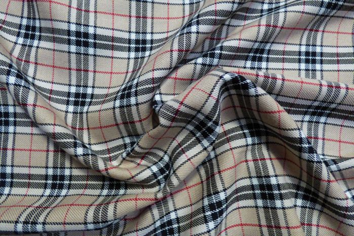 A Lovely Poly/Viscose Camel And Black Check Twill Suiting With Red Overcheck