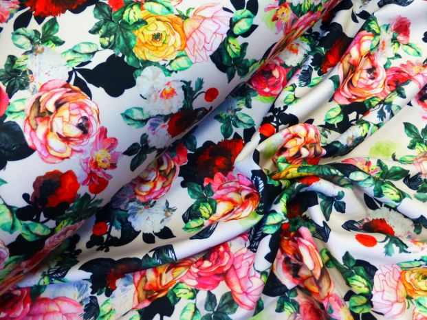 Another Striking Bold Watercolour Floral Scuba Jersey in Soft Pink, Cerise, African Green & Ruby Red