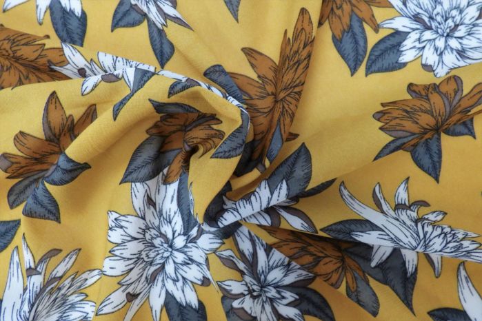 A Soft-Touch Crepe Pongey Digital Floral Print in Tones of Ivory, Mustard, And Grey On A Gold Background