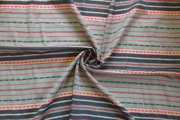 A Lovely Ex Italian Deadstock Designer Denim Chambray Look Jacquard Woven Stripe in Tones of Navy Blue, Natural and Dark Red.
