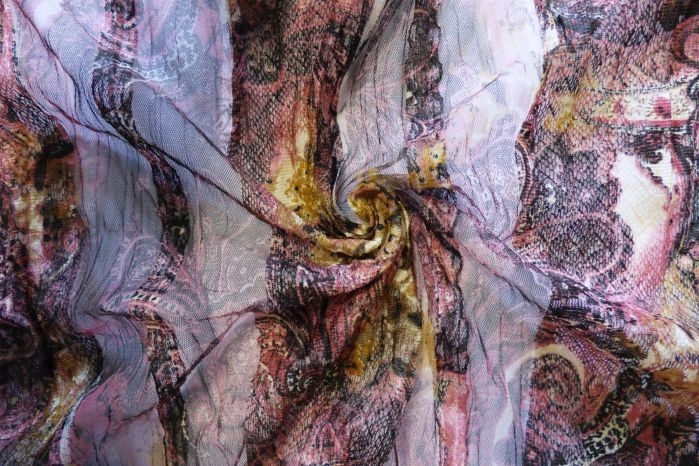 An Ex-Karen Millen 100% Polyester Delicate Mesh Lace Fabric in a Pink Paisley Design with Stripes Running Through.