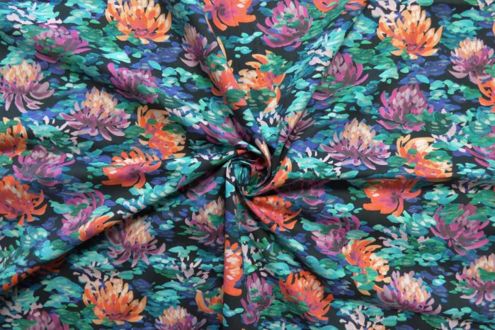 A Stunning And Unique Digital Abstract Lily Print In Tones Of Magenta Plum, Fiery Coral, Aqua, Bottle Green And Peach On A Midnight Background