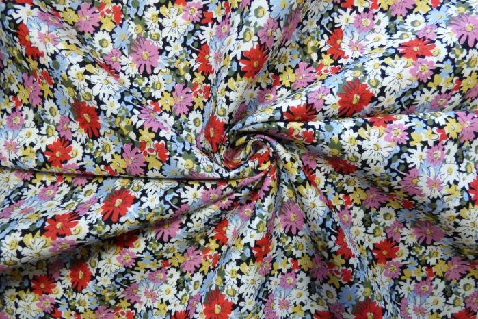 A Lovely Digital Printed Floral Poplin in Warm Tones on a Black Background