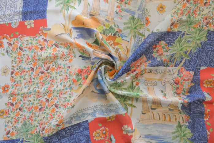A Lovely Nicole Voile Lawn Digital Abstract Landscape And Floral Print in Tones Of Ivory, Scarlet, Soft Sage, Sky Blue And Royal Blue