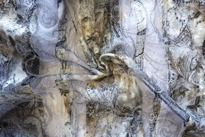 An Ex-Karen Millen 100% Polyester Delicate Mesh Lace Fabric in a Grey Paisley Design with Stripes Running Through.