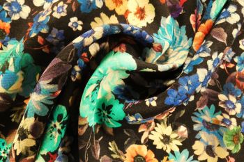 A Lovely Woven Soft Crepe Morracain Digital Variable Pebbles Print In Tones Of Peach, Turquoise, Black And Sage On A Marine Blue Background