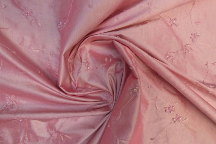 A Beautiful 100% Silk Rose Pink Embroidered Dupion with Floral Designs Featuring Delicate Beads