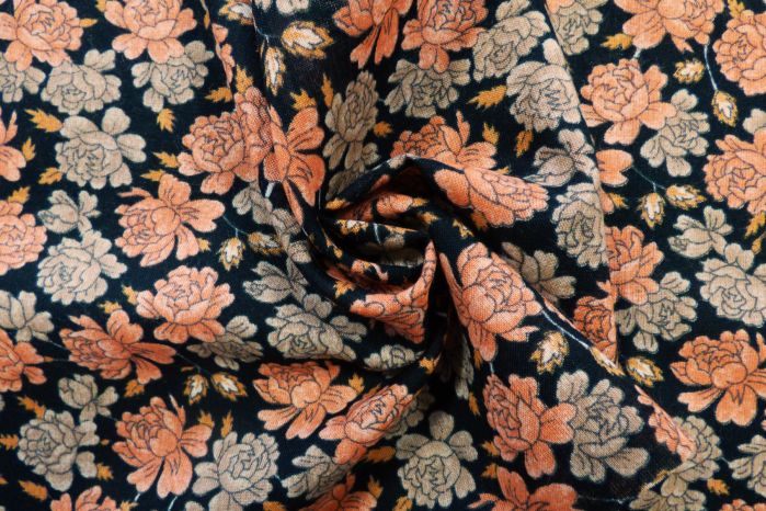 A Lovely 100% Wool Digital Printed Challis Crepe Vintage Floral Design in Cinnamon, Black & Tan