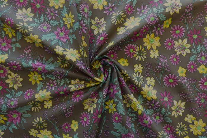 A Lovely Premium Quality Poplin Digital Autumn Flower Print In Shades Of Purple, Yellow, Brown & Green.