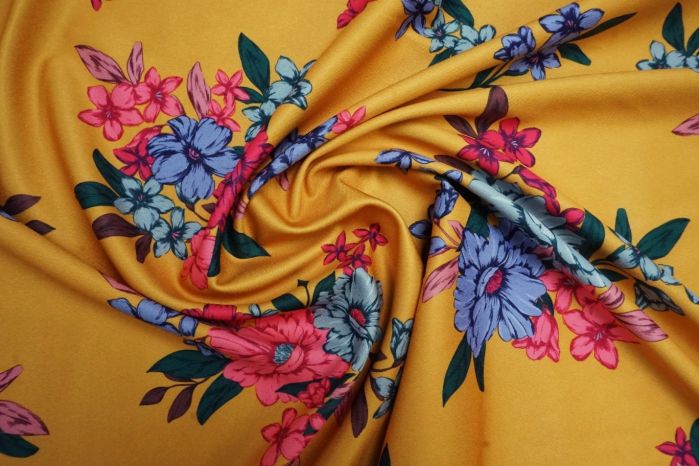 A Luxury Teko Scuba Digital Printed Jersey in Ochre, Bright Pink and Purple Tones