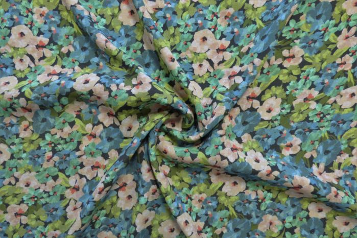 A Lovely Woven Soft Crepe Morracain Style Digital Abstract Floral Print In Tones Of Spearmint, Cornflower Blue, Nude Pink, Olive Lime Green And Black