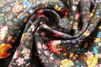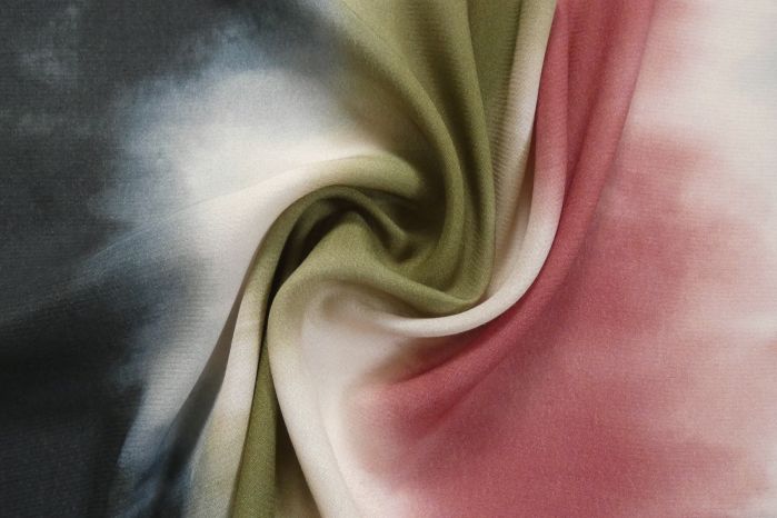 A Lovely Woven Soft Crepe Morracain Digital Ombre Print in Tones of Black, Grey, Olive Green, Brick Red and Cream.