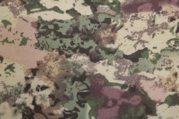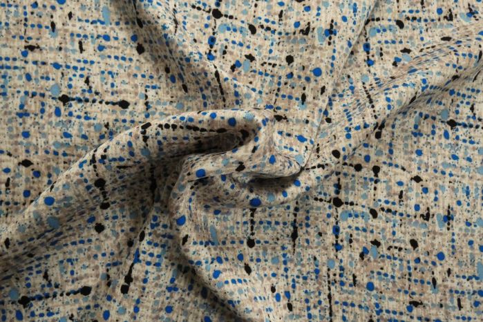 A Lovely Soft Touch Organic Rayon Gemma Sateen Digital Abstract Spot Print In Tones of Cobalt Blue, Sky Blue, Black, Beige, and Ivory.