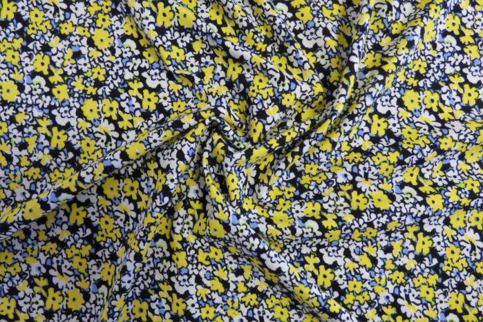A Lovely Soft Jersey Digital Floral Print In Tones Of Sunshine Yellow, White, Black And Cornflower Blue
