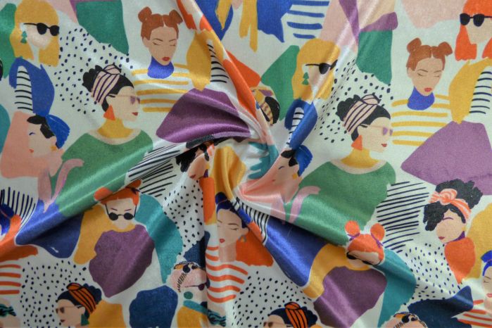 A Beautiful Plush Velour Colourful Digital Print In Tones Of Red, Ochre, Blue And Green