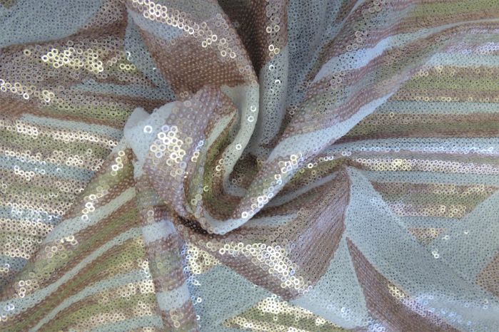 An Allover Small Sequin Retro Design In Gold, Taupe And Ivory On A Knitted Mesh Base Cloth
