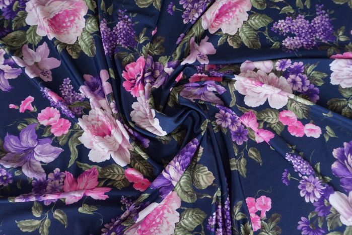 A Beautiful Slinky Jersey Digital Print in Navy, Violet and Pink Tones