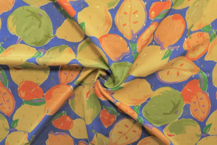 A Beautiful Drapey Viscose Vienna Lawn With Elegant Viscose Dobby Threads Digital Fruits Print In Tones Of Lemon Yellow, Pale Green, Apricot Orange And Bluebell Blue