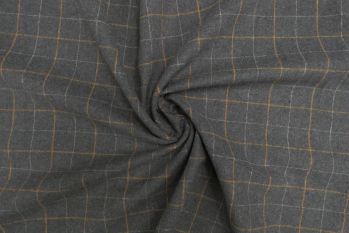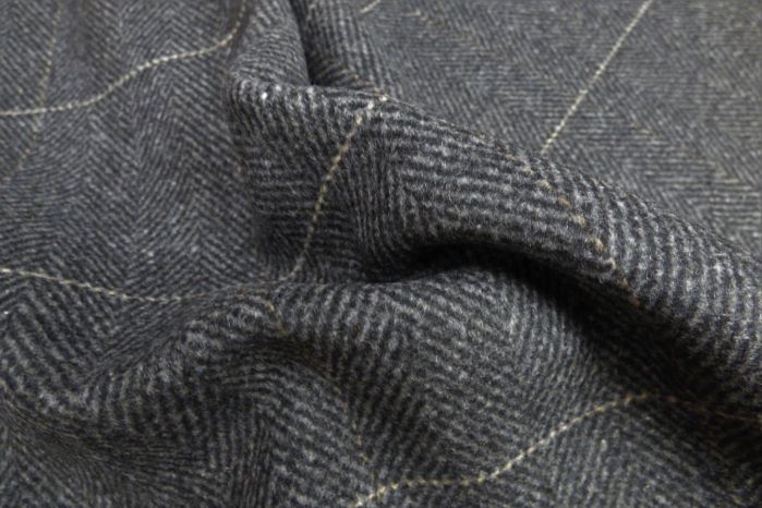 A Beautiful Herringbone Tweed Reversible Jacketing Coating in Graphite with a subtle Cream Pinstripe Outline Overcheck