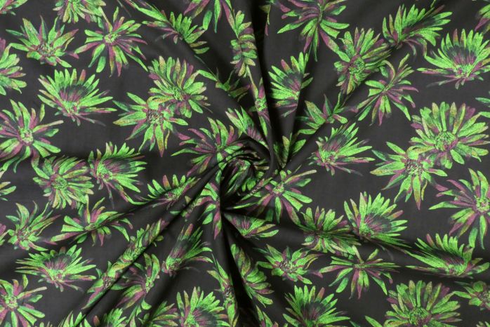 A Lovely Cotton Marlie-Care Lawn Digital Floral Print in Tones of Bright Lime Green and Purple on a Midnight Background