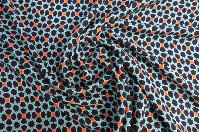 A Lovely Spun Viscose Soft Challis Lawn Digital Print in Orange and Light Blue on Midnight