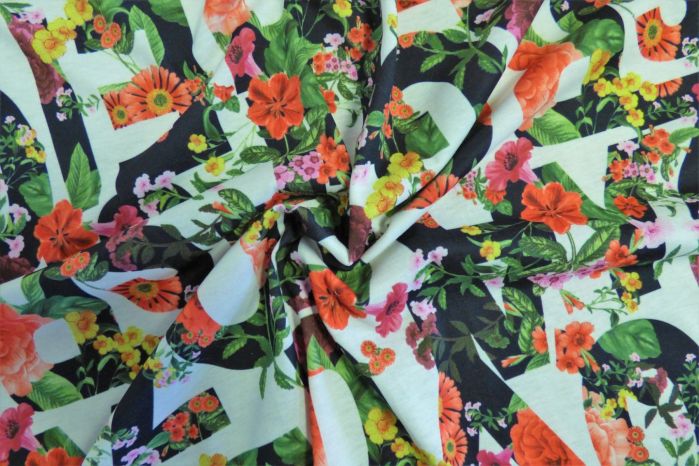 A Lovely T-Shirt Knitted Jersey Digital Letters Print In Tones Of Green, Coral, Pink And Yellow On A Black And Ivory Background
