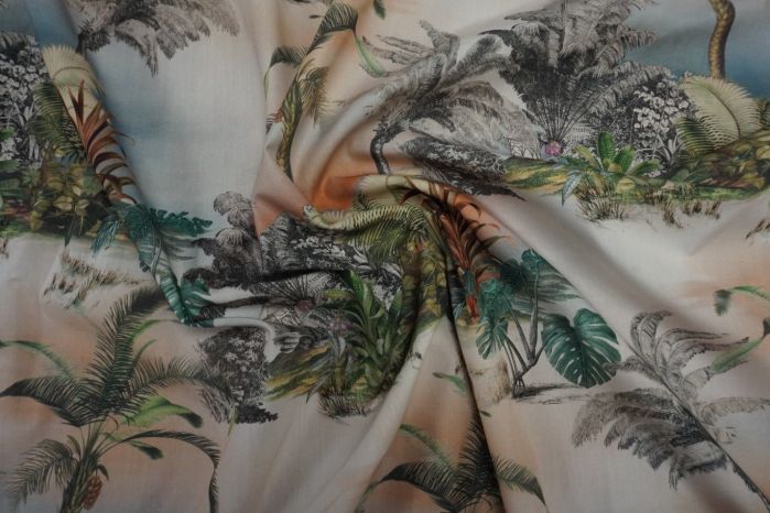 A Stunning Cotton Pesanté Poplin Digital Print with an Interesting Island Design in Green and Orange Tones