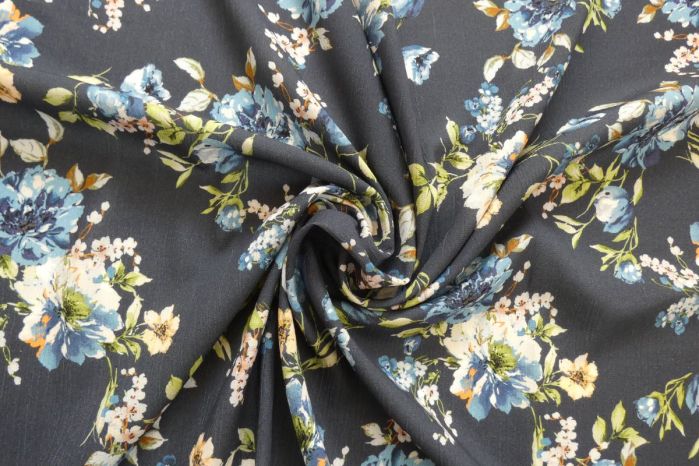 A Beautiful 100% Organic Rayon Crinkle Digital Floral Print in Tones of Navy, Blue, Tan and Green