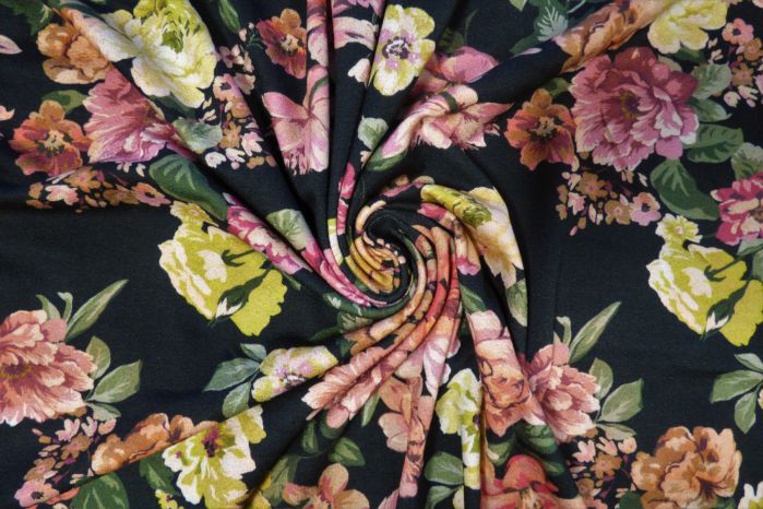 A Stunning Viscose Crepe Jersey Floral Print In Tones Of Rose Pink, Fuchsia, Nude Pink, Lime And Forest Green On A Midnight Background