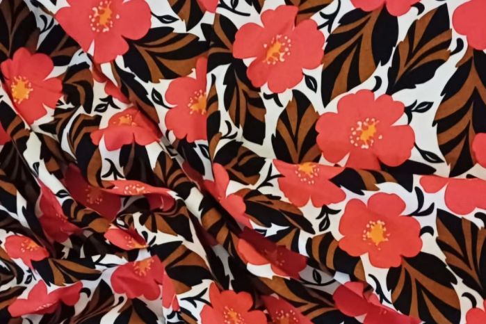 A Lovely Large Scale Digital Floral/Leaf Print in Tones of Salsa, White, Mocha, Tan and Orange.