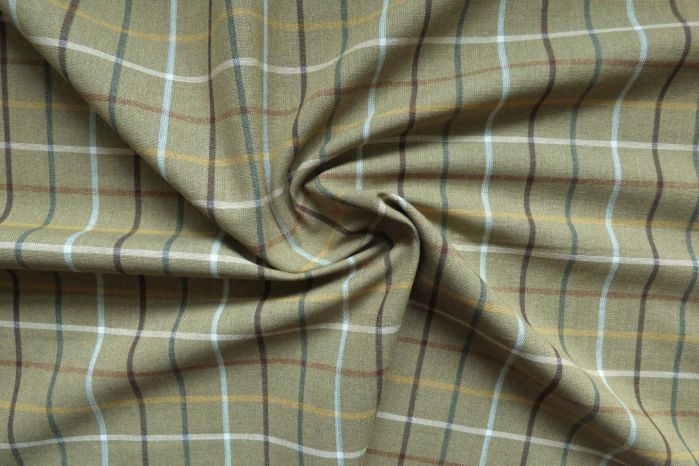 A Lovely Medium Weight Plaid Check In Tones Of Khaki, White, Dark Teal, Buttercup Yellow And Dark Brown