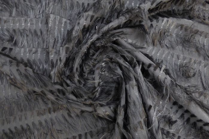 An Embroided Tassle Taffetta. Made in Japan. Amazing, Sophisticated Synthetic Tassle Hair Woven into a Black Soft Touch Taffetta Fabric.