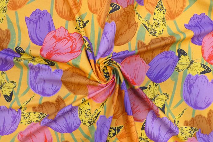 A Lovely Cotton Marlie-Care Lawn Digital Vibrant Tulip And Butterfly Print in Tones of Pink, Orange, Lilac & Yellow