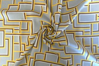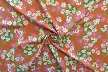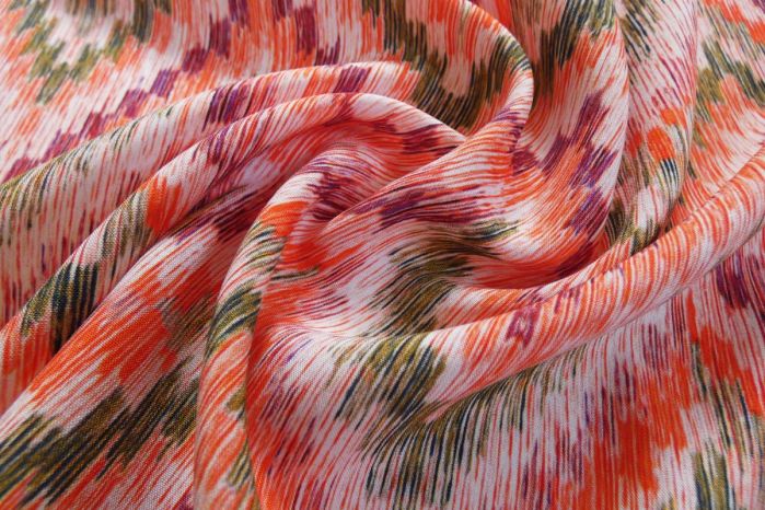 A Lovely Viscose Challis Lawn Digital Abstract Print in Tones of Orange, Olive Green, Sangria and White.