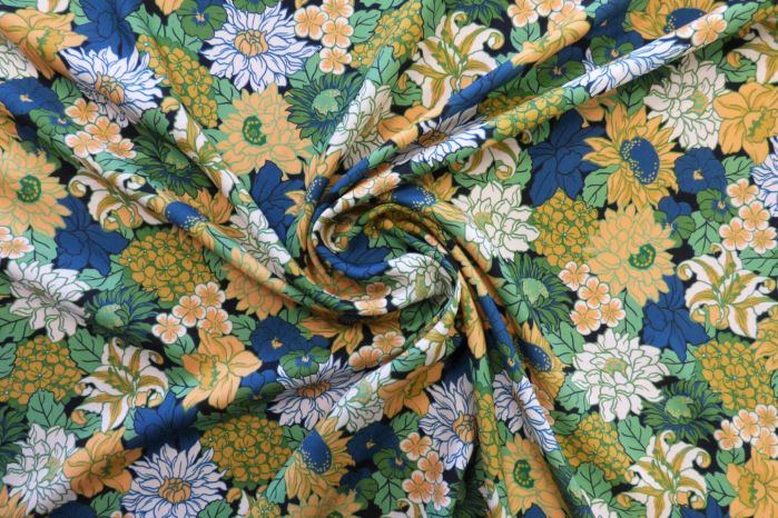 A Stunning Viscose High Twist Rickardi Lawn Digital Floral Print In Navy, Mid Green & Peach Tones